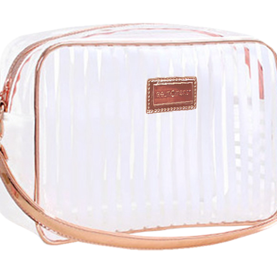 This Beauty Bag comes in three separate colours, all transparent with either pink, white, or black stripes with gorgeous rose gold detailing and a convenient strap. Why not take this opportunity to get one of each?
